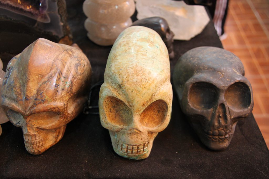 İçerilere doğru devam ettiğimde çeşitli çakra taşları ve orta alandaki masanın üstünde birçok kafatası. Ama insana ait kafatasları olmadıkları çok açık! Dükkana bakan kişiye sorduğumda ise bu bölgede eski dönemlerde bulunan uzaylı kafataslarının birer kopyaları olduğunu söylüyor. Turist yalanı olduğuna inanmak istemiyorum çünkü uzaylıların olduğunu kabul etmek çok daha heyecan verici!